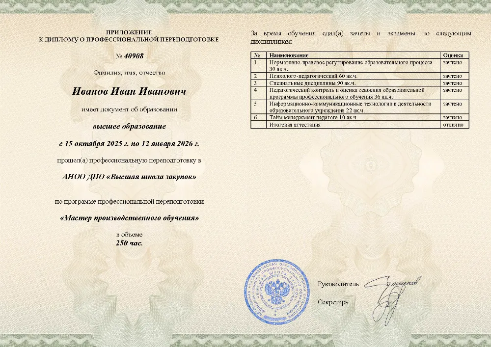 Профессиональная переподготовка, 250 академических часов, 11 модулей: нормативно-правовое обеспечение, основы педагогики и психологии, проектирование образовательных программ, методика профессионального обучения, педагогический контроль, применение ИКТ и тайм-менеджмент педагога. Онлайн-обучение в в Новосибирске с итоговой аттестацией.