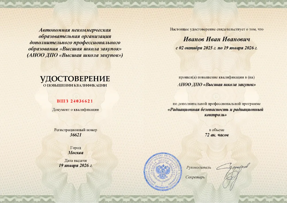 Повышение квалификации, 72 академических часа, 9 модулей: законодательное и нормативное обеспечение, дозиметрия и приборная база, лицензирование, методики радиационной защиты при эксплуатации и обслуживании установок, действия при авариях и ЧС. Онлайн-обучение в в Новосибирске с итоговой аттестацией.